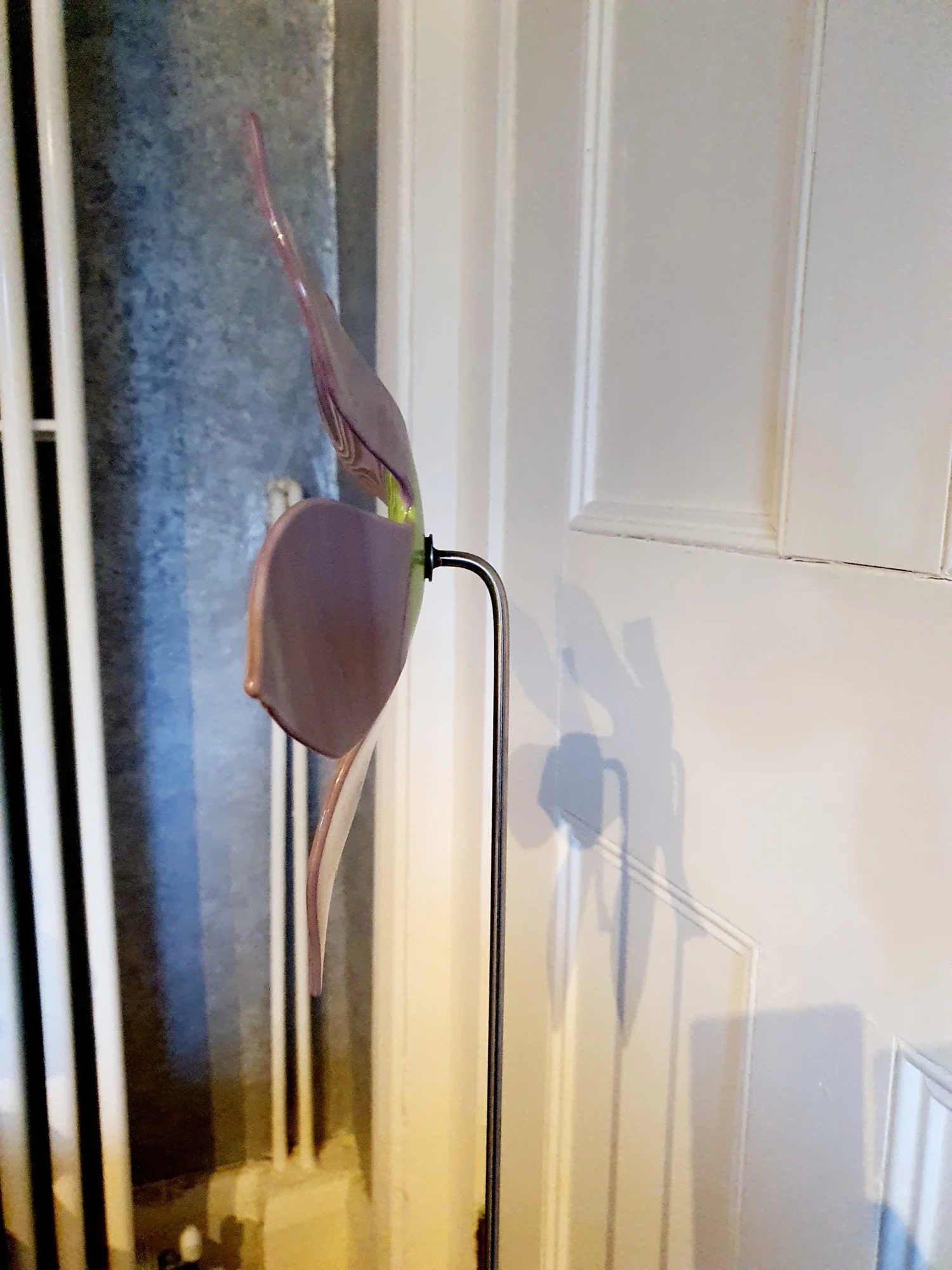 This product is perfect for showcasing your fused glass flowers. The rod is powder coated stainless steel with rubber washers, stainless steel nut and plastic cap. Height of stem is 50cm tall with an M6 thread which fits a 6mm diamond drill bit. Fits glass up to 10mm thickness. Bottom end has blunted point. For this rod we will hand bend the stem to be at approx 90% angle.